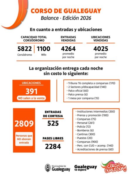 En el mismo sentido, la organización reconoce en ese cuadro que hay 391 ubicaciones que no salen a la venta y se reparten entre comparsas, discapacitados y funcionarios, y 2.809 personas que no pagan entrada, entre comparsas, instituciones y clubes.